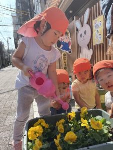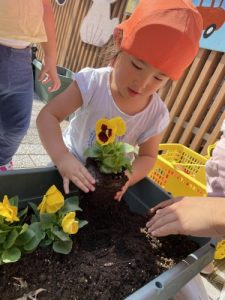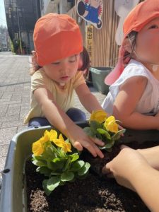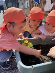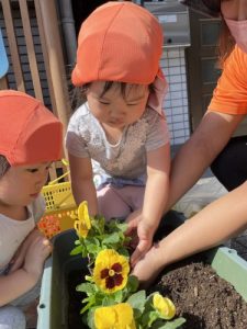 ?2歳児クラスりんご組さんはパンジーの苗をプランターに植え替えました?