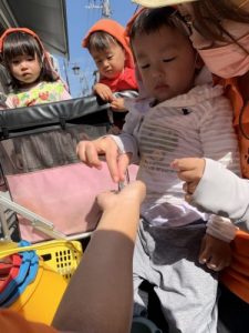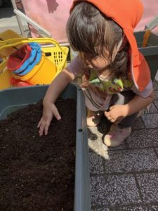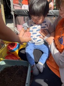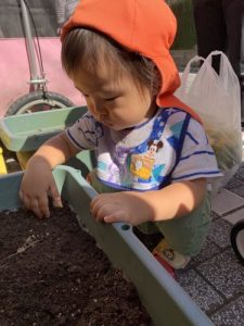 保育者がパンジーの花を見せながら紹介をしている間、真剣な眼差しでお話を聞いていたりんご組さん。1人1つずつ苗を持って土の中に置いて、保育者が「お花にもお布団掛けてあげようね〜」と言うと皆優しく上から土を被せてあげていました?