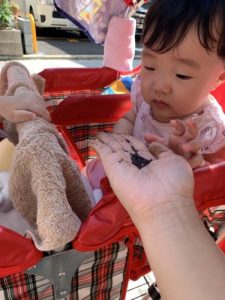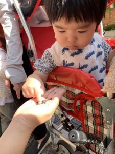 ジーッと見る子、指でツンツン突いてみる子、匂いを嗅いでみる子など、それぞれで小松菜の種を感じていました。