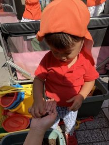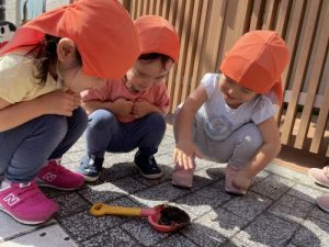土を耕している時にはミミズを発見し、スコップですくって見せてみると、怖がったり嫌がることなく皆近くまで寄って来てニコニコ観察していました?✨