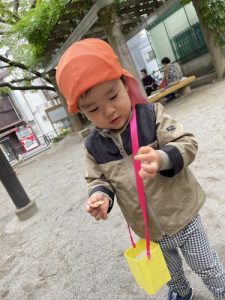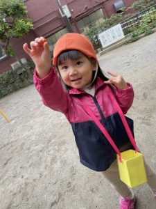 牛乳パックで作った可愛らしい、ポシェットをさげて秋の探索活動に出発!