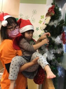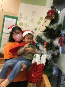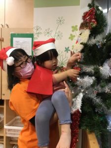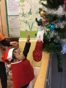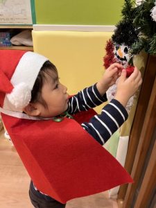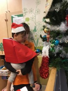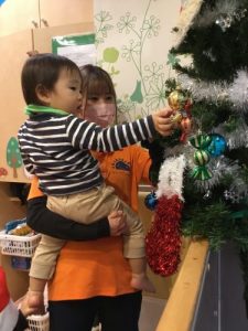 玄関前にクリスマスツリーを出して、みんなでツリーに飾り付けをしました?