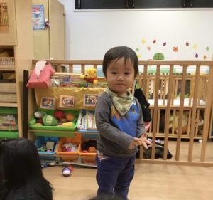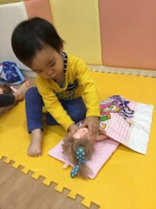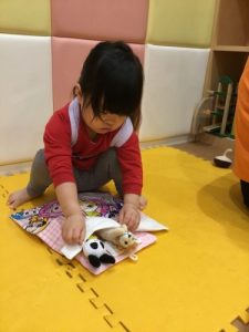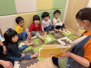 季節の本や動物が出てくる絵本など自分から気になった絵本は手に取り、ペラペラと捲る中でお気に入りのワンシーンを見つけるお子さま達。大好きな保育者の膝や隣で見たり、日によって色々な保育者に読んでもらったりと絵本も遊びの中で親しんでいる様子が見られます?