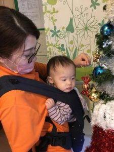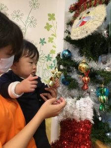 保育者に抱っこをされてツリーに近付くとカサカサと揺れるモミの葉やモールに大喜び?