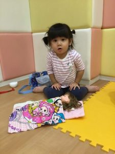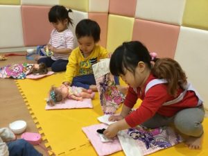 おままごと遊びに欠かせない生活用品に大喜びしており、大切に使ってほしい思いからお約束事としてお友だちと仲良く順番に遊ぶ事、作った物は壊れやすいから優しく大事に触ったり持ったりする事などをお話し、遊び方も伝えました?