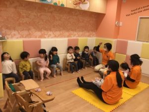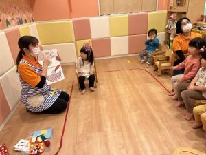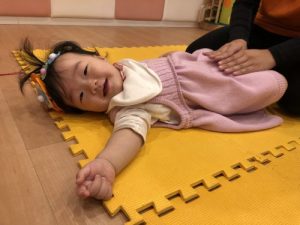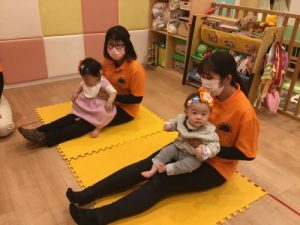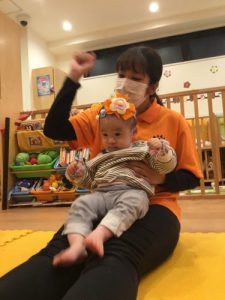 歌に合わせた保育者との触れ合い遊びにニコニコな?もも組さんです。
