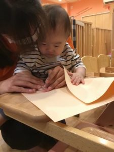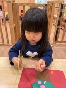 ?チョキチョキはさみに挑戦!保育者の手を借りながらとても真剣な表情です。