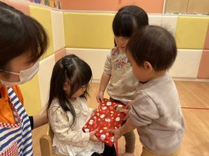 ?りんご組さんのお友だちがプレゼントを渡してくれています。