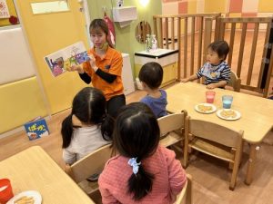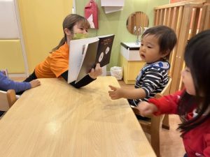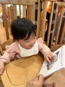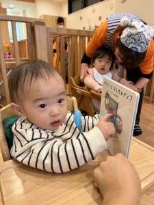 保育者が絵本を持って近付くとみんなでボタンを押して次の展開を楽しみに待っている姿が可愛いです?