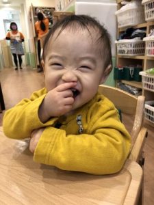 1歳児クラスのいちご組さん?は自分でできることがたくさん増えてお歌も上手に歌えるようになりました!?