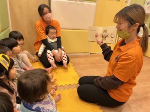 ♪おしくら まんじゅう おされて〜とリズミカルに歌う保育士と一緒にお子さまたちも、「ぎゅー」や「ぷるるーん」と効果音を口々に言って、合いの手を入れてくれるんです?