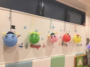 先週作った鬼のお面に、豆に見立てた新聞紙豆をしっかり鬼に当てられるように力いっぱい「えいっ!」と投げて練習もしました!