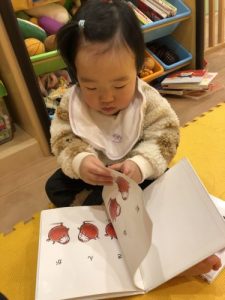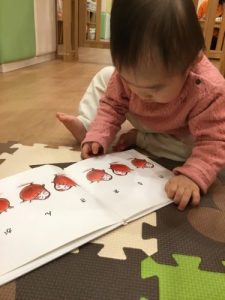 だるまさんシリーズの絵本がお気に入りで集中して1ページずつめくっています?