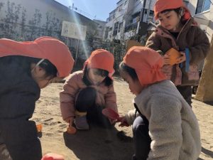 ?2歳児クラスりんご組さんは仲良くみんなで何かを発掘しているようです?
