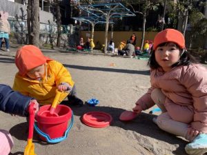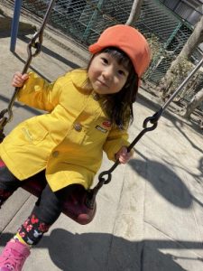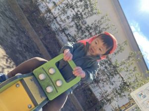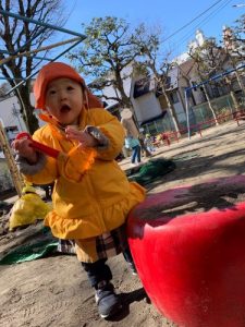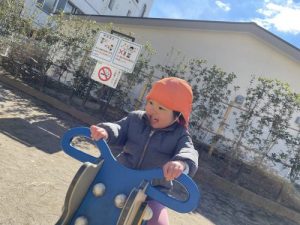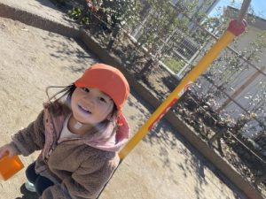 いちご組さん?もお砂遊びや追いかけっこだけではなく、りんご組さん?が遊んでいる様子を見て、スプリング遊具やブランコ遊びなども挑戦するようになり、遊びの中でお約束事を一緒に聞いたり、順番に交代したりなどお兄さんお姉さんになってきたなぁと感じる姿が見られました?