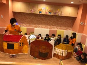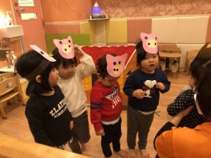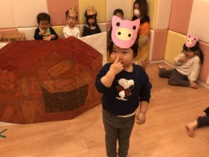 その職員の言葉や動きを真似てお友だち同士楽しむ姿から今年度の卒園式でも白山園全員で劇ごっこ遊びを披露することにしました?絵本の読み聞かせの中で繰り返しのあるフレーズやリズミカルな言葉が気に入り何度も?「読んで!」?「今日も見た〜い」という大好きな『3匹のこぶた』の劇ごっこが面白そう!と大盛り上がり✨