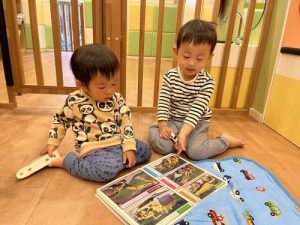 ひとつ大きくなったりんご組のお友だちが、いちご組のお友だちにおもちゃを渡してあげたり、