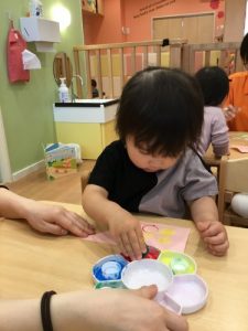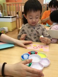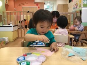 色んな色の絵の具を選んで、こいのぼりにスタンプをペッタンペッタン!「赤!黄色!」「黄色好き〜!」など嬉しそうに、みんな好きな色を使って、素敵なこいのぼりを作ってくれていました^ ^さすが、りんご組さん、製作が終わるまで、しっかり椅子に座ることができ、「出来た〜!」と保育者に見せてくれていました。椅子に座り作業に集中できるようになり、成長をとても嬉しく思います(^ ^)