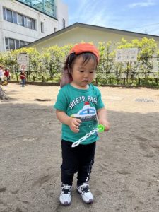 先生の真似っこで頑張って、もも組さんにシャボン玉を見せたい様子のりんご組のお兄さん☺️