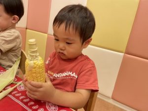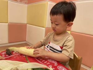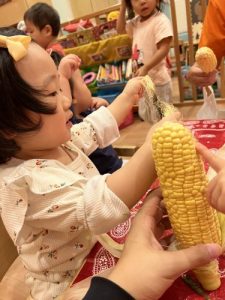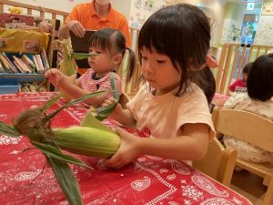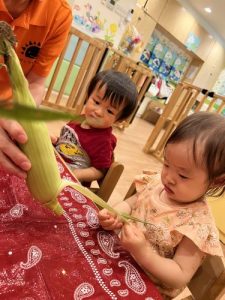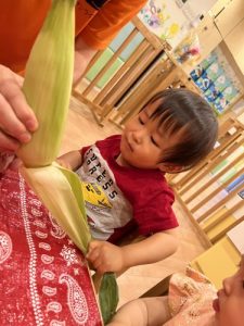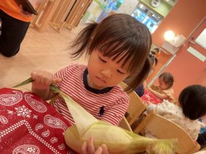 普段見慣れない皮のついたとうもろこしに、みんな興味津々な様子でした♪