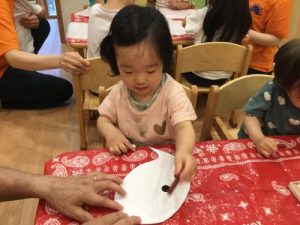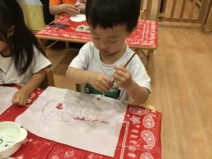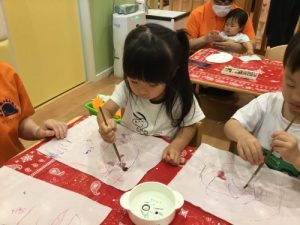 ?りんご組さんは、半紙にペンでお絵描きをした上に筆でなぞりにじみ絵をしました。