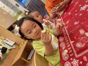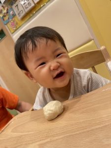 初めての感触に、少々びっくりした様子のお子さまもいましたが、保育者やお友だちと一緒にさまざまな形を作り、楽しむことができました^_^