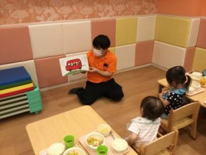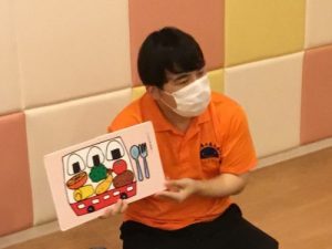 冒頭の「バスにのってください」というセリフから始まって、誰も乗っていない真っ赤なバス(というかバスに名を借りたお弁当箱)が、次第に愛くるしい表情のおかずたちで満員になっていく様を描いたこの作品は、親しみやすいキャラクター設定とほのぼのするタッチが相まって、白山園でもお子さまに人気の一作です☺️