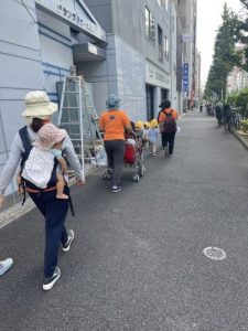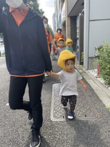 まだまだ暑い気温の中だったため、防災頭巾を取ったお子さまたちの頭には、