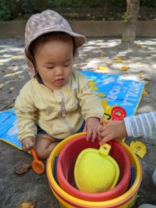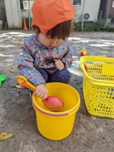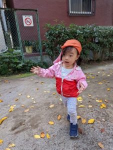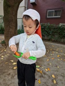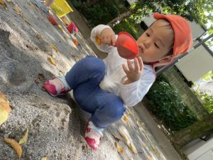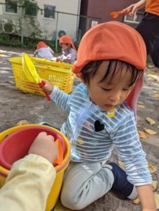公園に行くと色とりどりの落ち葉に興味深々のお子さまたち。