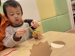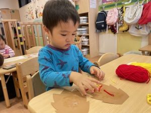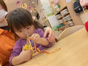 チョキチョキと毛糸を切り、ミノムシに貼り付けて上手にミノムシができました🎶