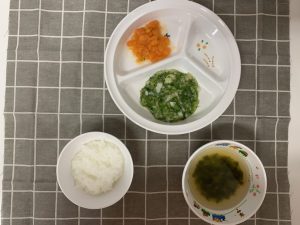 粥 味噌汁(小松菜) 白身魚のくず煮  人参甘煮