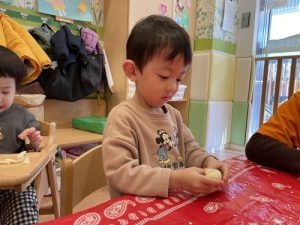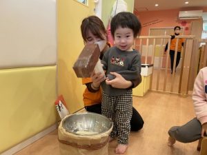 お餅つきでは、大きな小麦粉粘土を見て、少々不思議そうな様子も見られましたが、