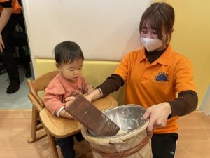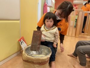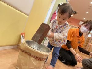 「ぺったん、そーれ!」と大きな声を出し、一人ひとりお餅をつくことができました✨