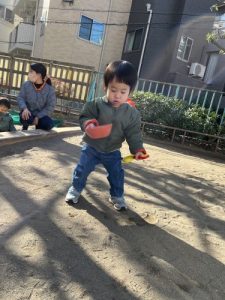 砂遊びでは、スコップやお皿を使ってのおままごとが子どもたちの中で流行っています♪