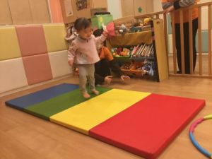 フラフープの上を上手にジャンプすると、カラーマットの上を青🟦緑🟩黄色🟨赤🟥と順番にジャンプジャンプ!