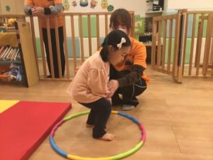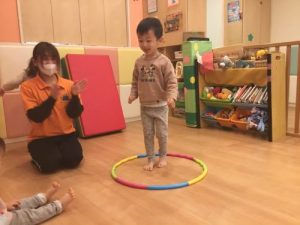 床においてあるフラフープに、ぴょーんとジャンプ!!