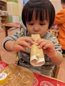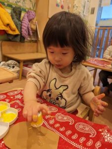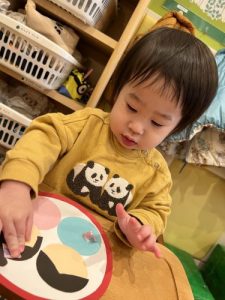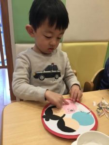 折り紙をちぎり、のりをつける作業に興味津々のお子さまたちです☺️
