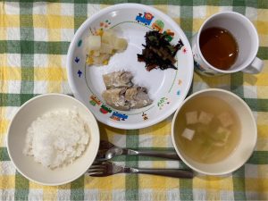 今日はさばの塩焼きです。スプーンで『さば』をごはんの上にのせて食べている子もいました!