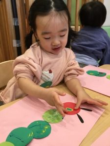 いちご組さんは、あおむし製作をしました。あおむしの体は、画用紙に歯ブラシに絵の具をつけて模様を描きました。