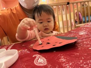 もも組さんは、大好きな太い綿棒スタンプを使って、てんとう虫と菜の花の製作を作りました。太い綿棒に絵の具をつけて、てんとう虫のからだにスタンプをペッタンペッタン!何度何度も楽しそうに押して、可愛らしいてんとう虫さんの出来上がり✨