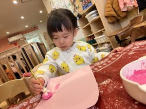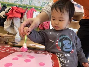 桜の花🌸は、大好きなピンク💕の絵の具をたんぽでぽんぽん🎨