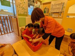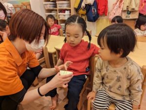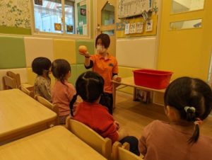 また食育をテーマに、お子さまがもっともっとお野菜を美味しく食べれるように、お野菜が好きになるように、お野菜の皮を剥いて見てもらったり、実際に水でゴシゴシ洗ったり、その後は保育者がお野菜を切り、断面を見て、中はどうなっているのか、また、どんな