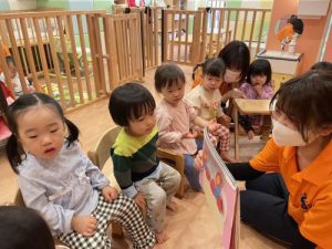 保育者からのお誕生日カードに、「何が書いてあるのかな?」と興味津々な表情のお子さまたちです(^ ^)