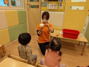 お子さま達は、食事では食べているけれど、実際に調理する前の玉ねぎを見て、「??!」と不思議そうな表情、でも皮を剥いていくと「あ!!」とひらめいたように嬉しそうな表情😊、「白いのが出てきた〜!」とお子さま達みんなの表情がクルクル変化し、とっても興味津々な真剣な表情は、なんだかいつもより、お姉さんお兄さんの成長した表情で、とても頼もしかったです!