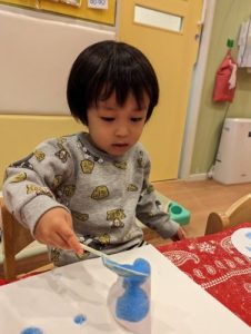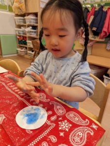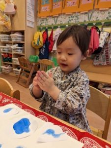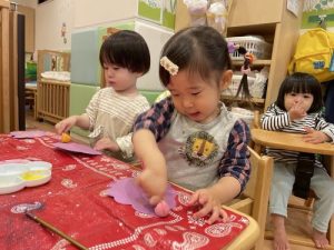 嫌がる様子は見せず、絵の具の冷たい感触に目をまんまるくしているお子さまたちでした👀