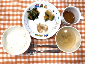 ごはん 味噌汁 魚のごまみそ焼き 小松菜のおかか和え かぼちゃの甘煮
