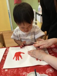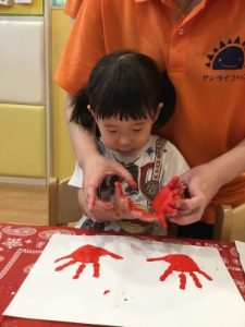ギュッギュッと紙に手型ができると「わあ!」と嬉しそうに保育士の顔を見たり
