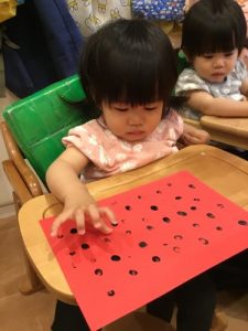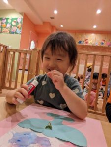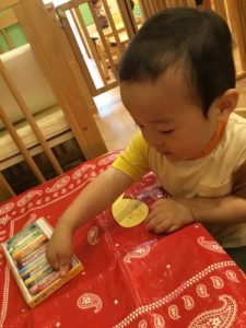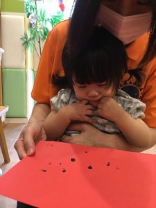 ちょんちょんと画用紙に色が付いたら”できた!“と嬉しそうな表情で