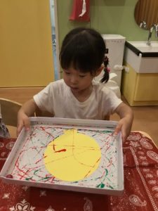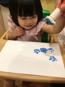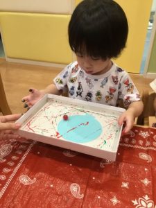 いちご組さんでは、ビー玉を転がし、絵の具で模様を描きヨーヨーの製作を楽しみました🎈