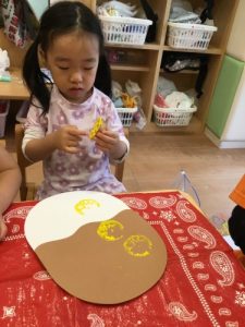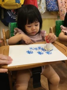 もも組さんは保育士と一緒にたんぽに絵の具をつけ、ポンポンと色をつけアイスクリームを作るのを楽しみました🍦